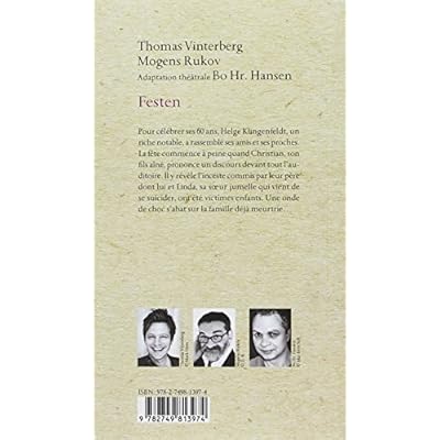 Pour célébrer ses 60 ans, Helge Klingenfeldt, un riche notable, a rassemblé ses amis et ses proches. La fête commence à peine quand Christian, son fils aîné, prononce un discours devant tout l'auditoire. Il y révèle l'inceste commis par leur père dont lui et Linda, sa soeur jumelle qui vient de se suicider, ont été victimes enfants... Une onde de choc s'abat sur la famille déjà meurtrie et après la sidération viennent l'incrédulité puis la colère. Les langues qui se délient et l'exclusion du père hors du cercle vont, peu à peu, les mener vers la voie de l'apaisement. La pièce est créée au Théâtre de l'Odéon à partir du 24 novembre 2017 dans une mise en scène de Cyril Teste avec Estelle André, Vincent Berger, Hervé Blanc, Sandy Boizard ou Marion Pellissier, Sophie Cattani, Bénédicte Guilbert, Mathias Labelle, Danièle Léon, Xavier Maly, Lou Martin-Fernet, Ludovic Molière, Catherine Morlot, Anthony Paliotti, Pierre Timaitre, Gérald Weingan et la participation de Laureline Le Bris-Cep.