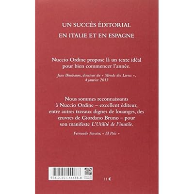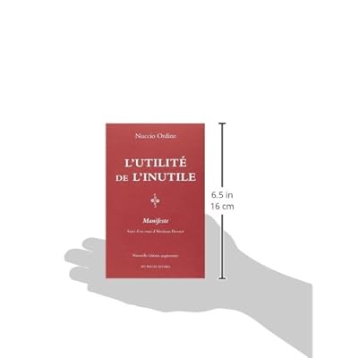 Découvert lors de mes études, j??avais très envie de plonger dans ce livre. Voici donc mon avis sur ce manifeste nommé « L??utilité de l??inutile ».Par Nuccio ORDINE et paru au Edition LES BELLES LETTRES, il s??agit du 5ème tirage (édition de Février 2015) de ce livre. Au format de 16.5 x 10.5 cm, le format broché composé de 230 pages. Le recueil est, par aspect, très beau et soigné.L??auteur d??origine italienne ORDINE, grand philosophe et professeur de littérature, nous dévoile ses connaissances et références à travers les réflexions de grands philosophes (Platon, Aristote, Tchouang-tseu, Montaigne, Bruno, Kant,?) et de grands écrivains (Dante, L??Arioste, Cervantès, Dickens, Ionesco,?)Un petit livre extra ! « L??utilité de l'inutile » nous rappelle avec des mots simples, que les valeurs de la vie se trouvent ailleurs que dans le matérialisme individuels, le profil mercantile et la minimisation du temps perdu. En alliant remarques pertinente ainsi que citations d'auteurs, ORDINE déplore l'orientation actuelle de notre manière de vivre, axé sur nous-même et obsédée par le gain.Conclusion: Un livre à lire et à faire lire que je recommande à toute personne curieuse et aimant la culture. L??auteur et ces références nous montre et prouve que l??art et la culture ne sont pas des choses futiles et ? inutiles !Produit reçu vite et bien protégé. Produit à un coût intéressant et correct.Je recommande cet ouvrage.Si ce commentaire vous a intéressé ou s'est avéré utile, cliquez sur « oui ». ?a fait toujours plaisir de se savoir utile et/ou lu.