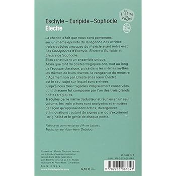 La réunion de ces trois versions d'?lectre est une bonne idée. On peut comparer les différentes visions du mythe, notamment avec la très bonne préface, qui présente une étude comparative assez détaillée (sur la structure des pièces, les personnages, les thèmes importants). Les notes de bas de page sont éclairantes. Seule question : pourquoi avoir mis les textes dans cet ordre ? Sophocle apparaît en dernier alors que je crois que la pièce a été écrite avant celle d'Euripide (à deux ans d'écart il me semble).La traduction est claire, la mise en page aussi.Concernant le contenu des pièces, on apprécie de retrouver des personnages mythiques et de voir comment leur histoire se construit et s'enrichit d'un auteur à l'autre.
