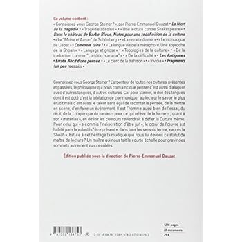 Cette sélection de quelques textes de cet immense essayiste et critique donne un aperçu de sa clairvoyance, lisez les passages sur la désagrégation du langage dans les zone périphériques, l'abandon d'une certaine forme d'enseignement etc Pour la partie critique Steiner ne fait pas partie des journalistes qui servent la soupe et quand il trouve une ?uvre mauvaise à son opinion il le dit ... Il faut respecter un philosophe qui a su encore dialoguer avec Pierre Boutang et reconnaître une certaine forme de mérite aux travaux d'Heidegger.
